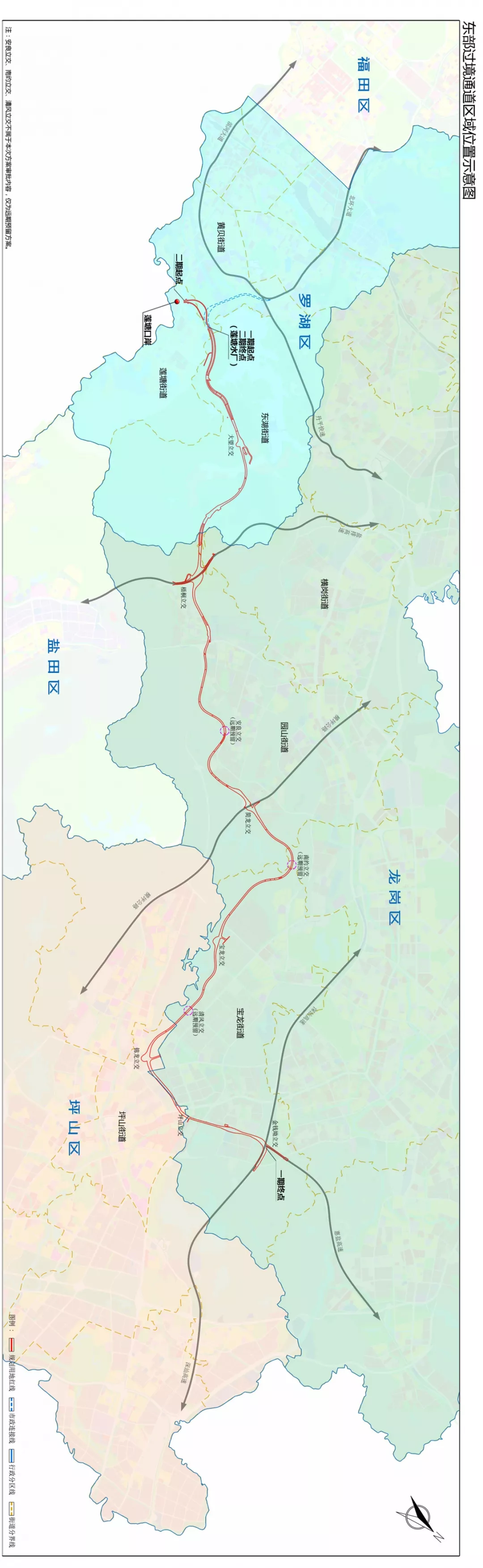 深圳市東部過(guò)境通道擬選址于羅湖區(qū)蓮塘街道、黃貝街道和東湖街道,龍崗區(qū)橫崗街道、園山街道和寶龍街道,坪山區(qū)坪山街道區(qū)域內(nèi)。