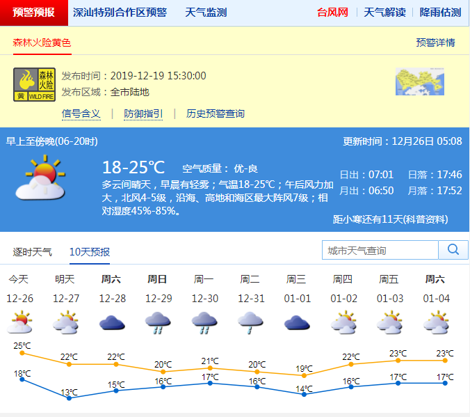 見圳客戶端·深圳新聞網(wǎng)2019年12月26日訊 今日白天多云,氣溫18-25℃,明天傍晚至27日受冷空氣影響,北風(fēng)加大,沿海、高地和海區(qū)最大陣風(fēng)7級(jí)左右,氣溫下降4-5℃,天氣轉(zhuǎn)涼。28日多云,29-30日有一次明顯降雨過程。