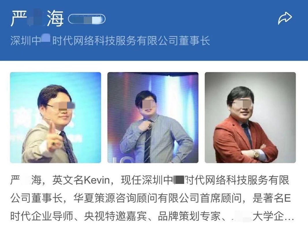 據(jù)介紹,董事長(zhǎng)“嚴(yán)某?!睂?duì)外宣傳資料顯示:著名E時(shí)代企業(yè)導(dǎo)師、品牌策劃專家、某知名大學(xué)企業(yè)轉(zhuǎn)型升級(jí)總裁班實(shí)踐導(dǎo)師,擔(dān)任過(guò)多家知名企業(yè)的顧問(wèn)。據(jù)被抓獲的團(tuán)伙成員交代,嚴(yán)某海自稱擁有雙碩士學(xué)歷,是香港大學(xué)學(xué)者,還是牛津大學(xué)博士。