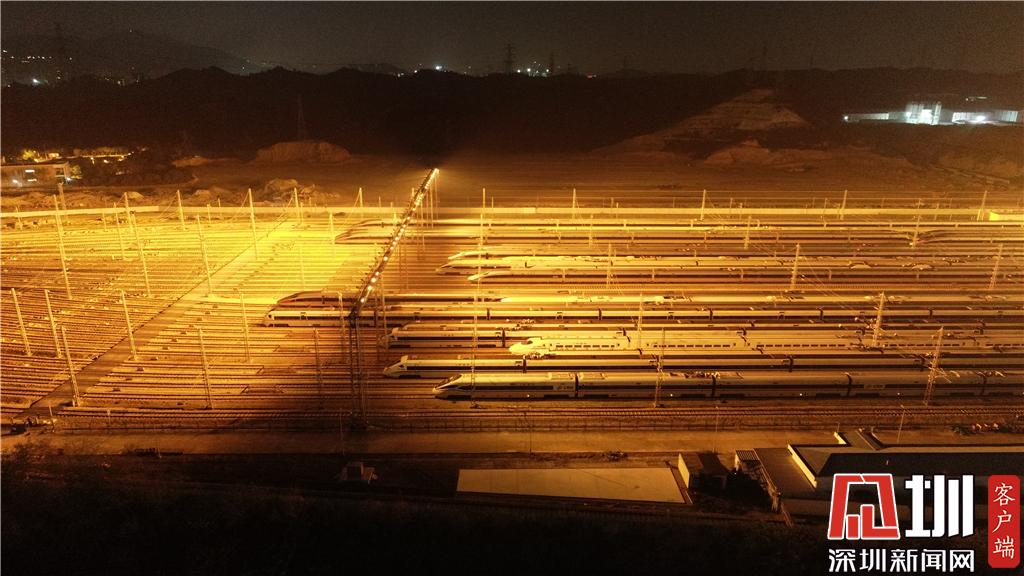 1月15日凌晨,深圳動(dòng)車(chē)運(yùn)用所內(nèi)的存車(chē)庫(kù)航拍畫(huà)面。