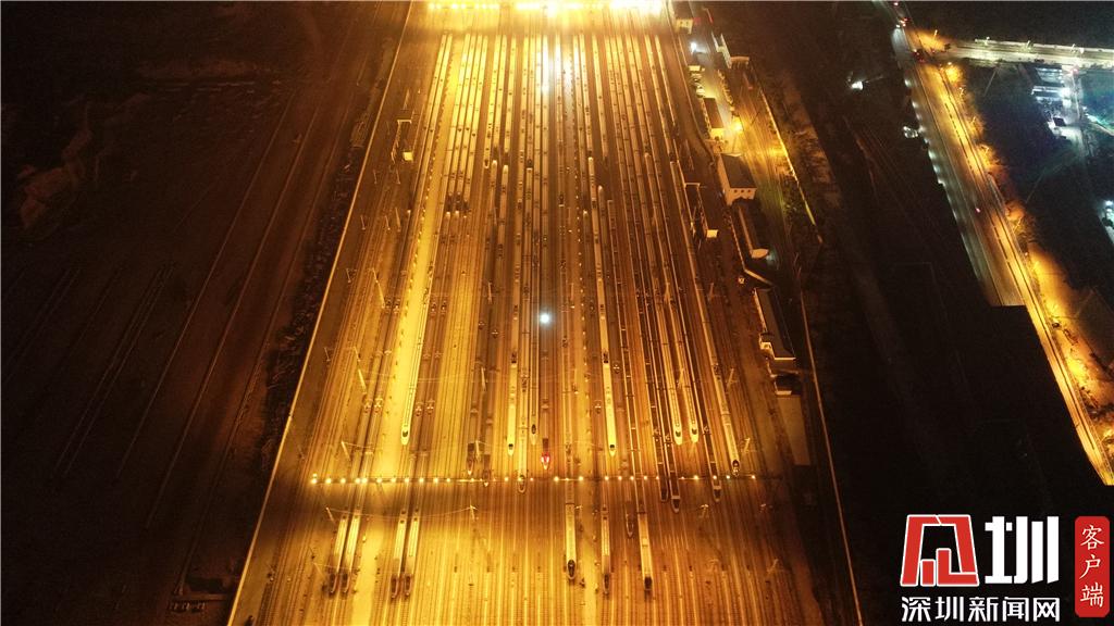 1月15日凌晨,深圳動(dòng)車運(yùn)用所內(nèi)的存車庫(kù)航拍畫面。