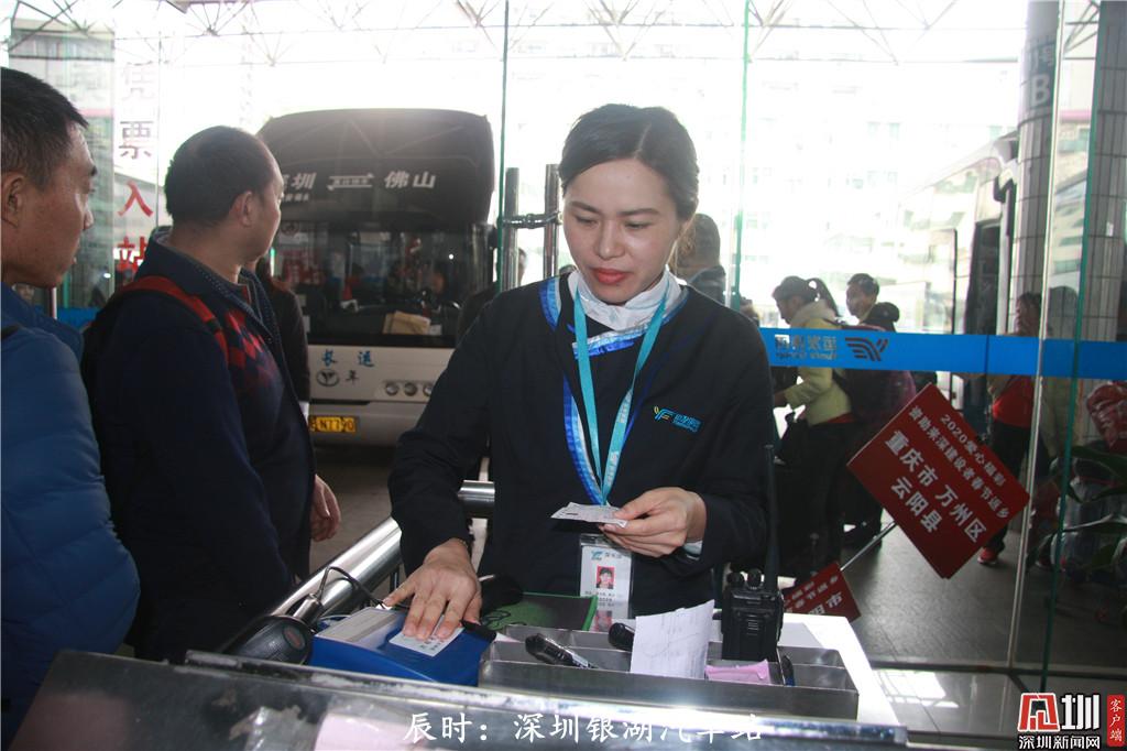 上午8點55分,銀湖汽車站檢票員吳偉燕正在對返鄉(xiāng)旅客進行檢票。