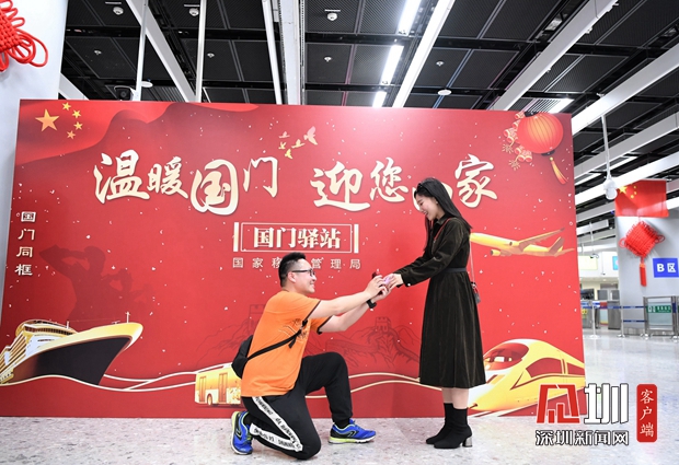 1月20日,西九龍邊檢站“國門驛站”展板前,在邊檢民警的掌聲和祝福中,旅客官先生鄭重向女友宋女士求婚,有情人終成眷屬,“在國門求婚,把愛人帶回家門”成為一段佳話。為營造溫馨喜慶的春節(jié)氛圍,該站在口岸設(shè)置主題活動展板,懸掛節(jié)日裝飾,還研發(fā)小程序,在驗(yàn)證臺一體機(jī)向旅客展示主題海報(bào),令人耳目一新。