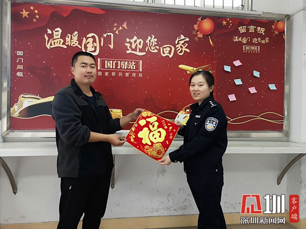 沙頭角邊檢站特別拍攝春節(jié)宣傳片,在口岸多個(gè)場地播放,營造“年”的氛圍,為出入境旅客送上小燈籠、“?!弊值刃《Y品,與旅客在執(zhí)勤現(xiàn)場合影,并當(dāng)場打印出照片贈與留念,讓每一位歸家的游子第一時(shí)間感受到祖國的溫暖和春節(jié)的幸福。