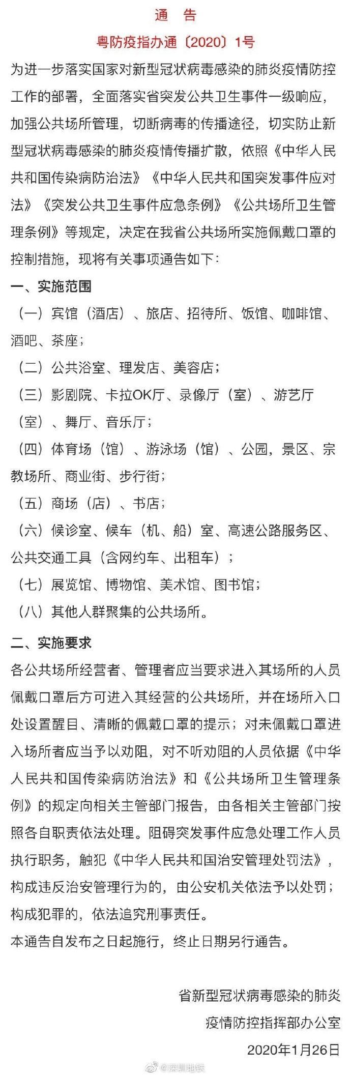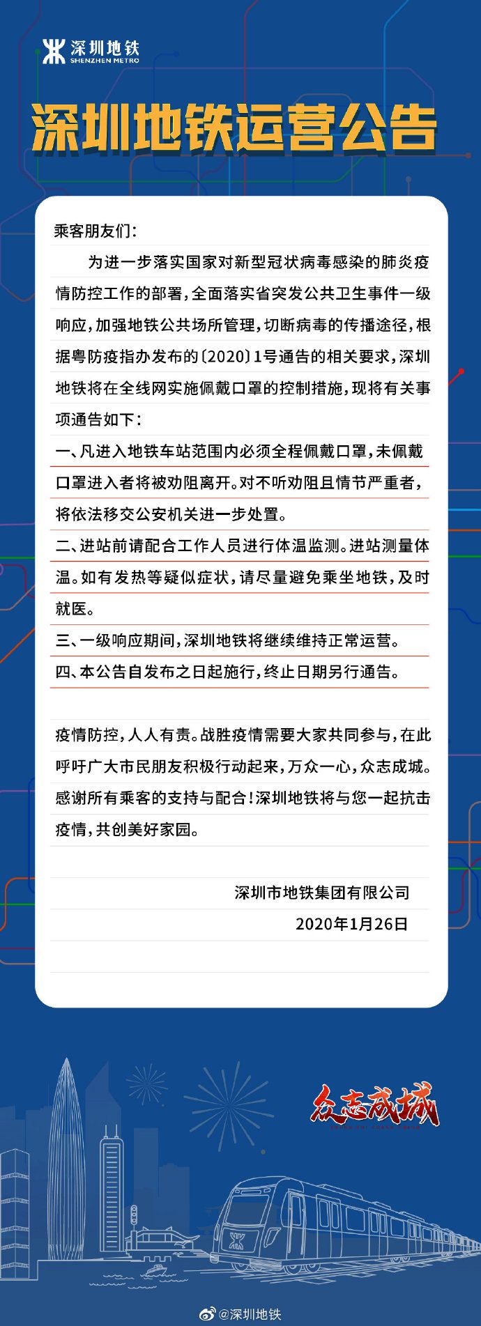 見圳客戶端·深圳新聞網(wǎng)2020年1月27日訊 深圳地鐵官方微博1月26日發(fā)布運營公告:根據(jù)粵防疫指辦發(fā)布的〔2020〕1號通告的相關(guān)要求,為全面落實省突發(fā)公共衛(wèi)生事件一級響應(yīng),加強地鐵公共場所管理,切斷病毒的傳播途徑,即日起,凡進入地鐵車范圍內(nèi)必須全程佩戴口罩,未佩戴口罩進入者將被勸阻離開。對不聽勸阻且情節(jié)嚴重者,將依法移交公安機關(guān)進一步處置。