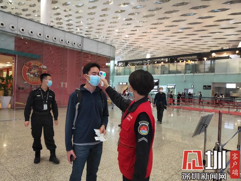 在深圳機(jī)場,工作人員對往來乘客進(jìn)行體溫檢測。
