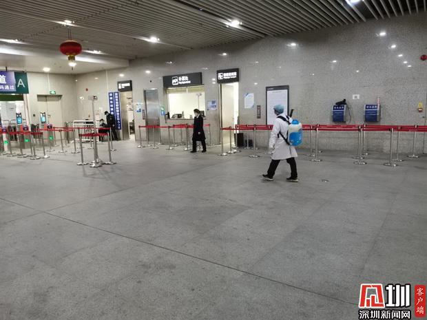 深圳火車站工作人員對候車室、站臺(tái)等區(qū)域進(jìn)行消殺。
