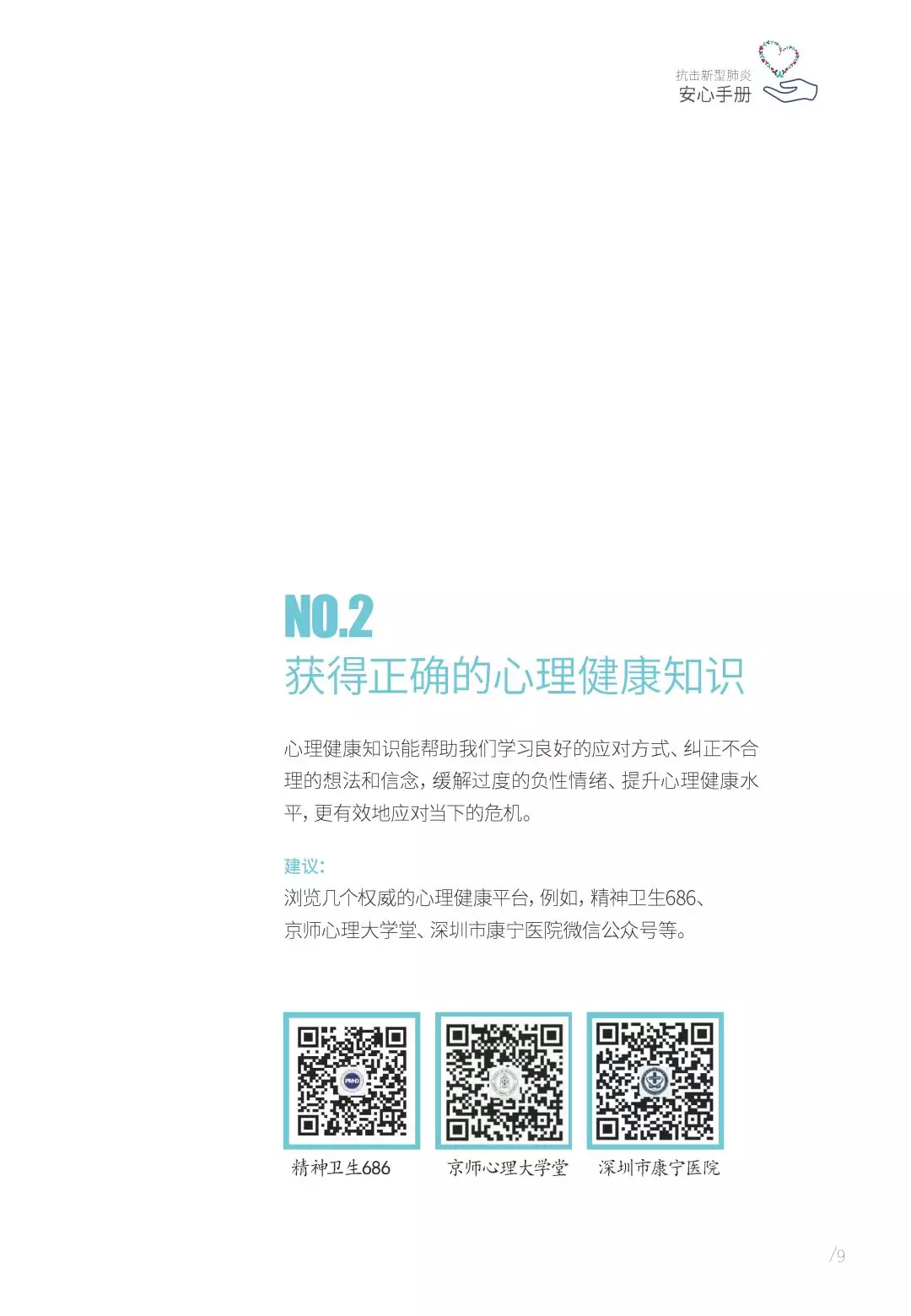 抗擊新型肺炎“安心手冊”由深圳市精神衛(wèi)生中心/深圳市康寧醫(yī)院支持,深圳市康寧醫(yī)院始建于1980年,是深圳市唯一一家集預(yù)防、醫(yī)療、康復(fù)、科研、教學(xué)于一體的公立三甲精神病專科醫(yī)院。2010年以來,醫(yī)院連續(xù)九年名列復(fù)旦大學(xué)醫(yī)院管理研究所中國最佳??婆判邪窬駥?漆t(yī)院前十位;2017年榮膺第五屆全國文明單位;2019年精神科獲評廣東省高水平臨床重點(diǎn)???。醫(yī)院服務(wù)在各類顧客體驗(yàn)度和公眾滿意度測評中,名列前茅。
