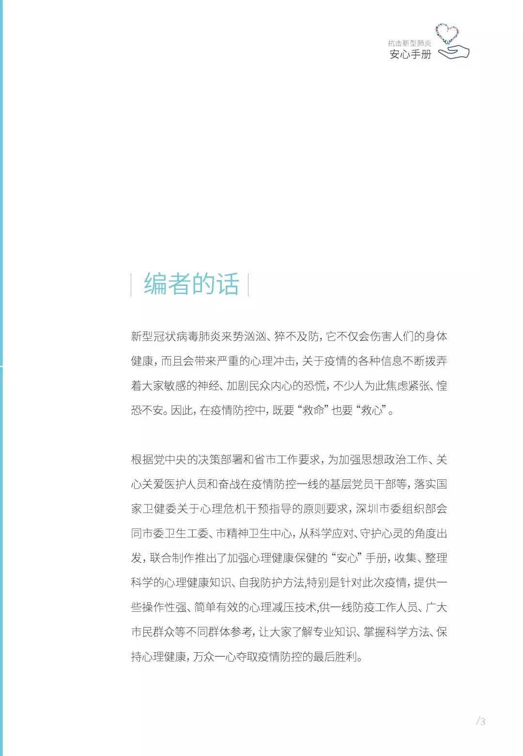 根據(jù)黨中央的決策部署和省市工作要求,為加強(qiáng)思想政治工作、關(guān)心關(guān)愛醫(yī)護(hù)人員和奮戰(zhàn)在疫情防控一線的基層黨員干部等,落實(shí)國家衛(wèi)健委關(guān)于心理危機(jī)干預(yù)指導(dǎo)的原則要求,深圳市委組織部會(huì)同市委衛(wèi)生工委、市精神衛(wèi)生中心,從科學(xué)應(yīng)對、守護(hù)心靈的角度出發(fā),聯(lián)合制作推出了加強(qiáng)心理健康保健的“安心”手冊,收集、整理科學(xué)的心理健康知識、自我防護(hù)方法,特別是針對此次疫情,提供一些操作性強(qiáng)、簡單有效的心理減壓技術(shù),供一線防疫工作人員、廣大市民群眾等不同群體參考,讓大家了解專業(yè)知識、掌握科學(xué)方法、保持心理健康,萬眾一心奪取疫情防控的最后勝利。