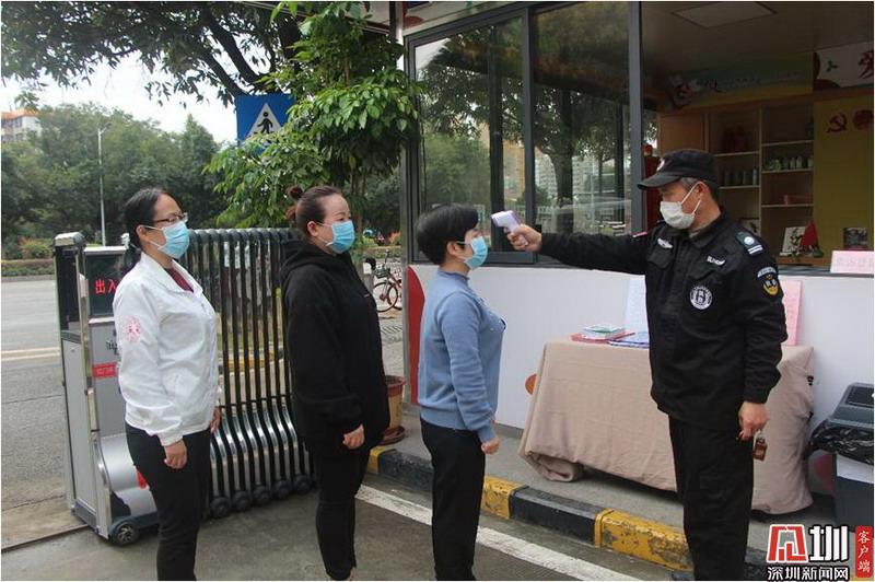 上午8點(diǎn)30分,海樂(lè)社區(qū)黨群服務(wù)中心社區(qū)工作站的保安正為義工測(cè)量體溫。