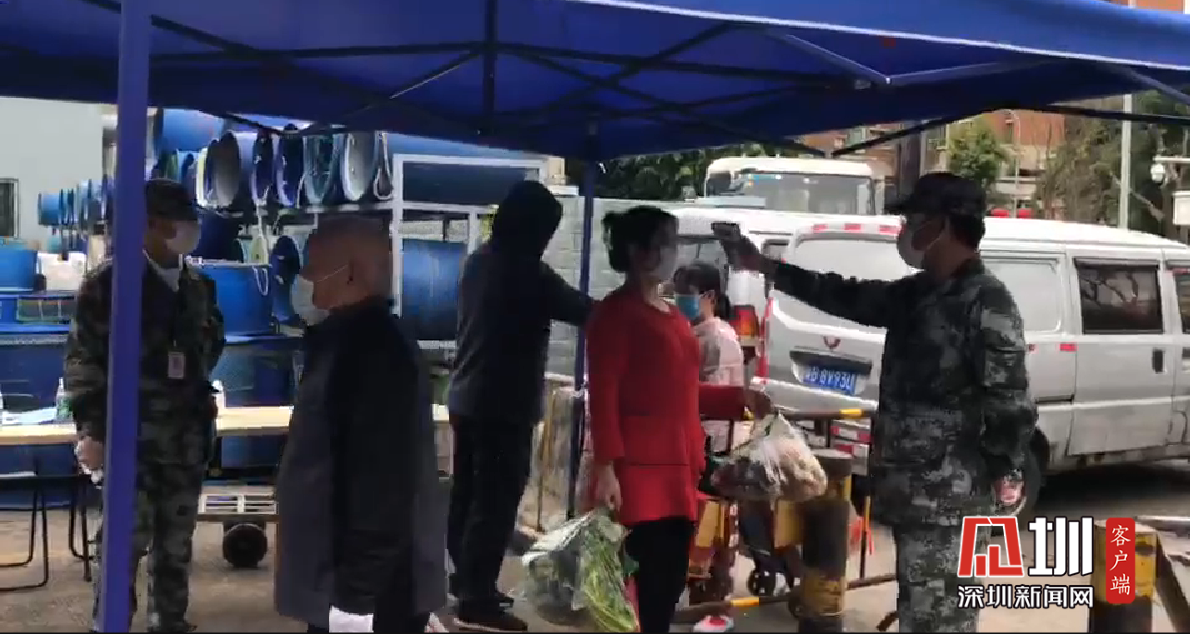 福田農(nóng)批市場出入口處配備專人進行體溫測試。