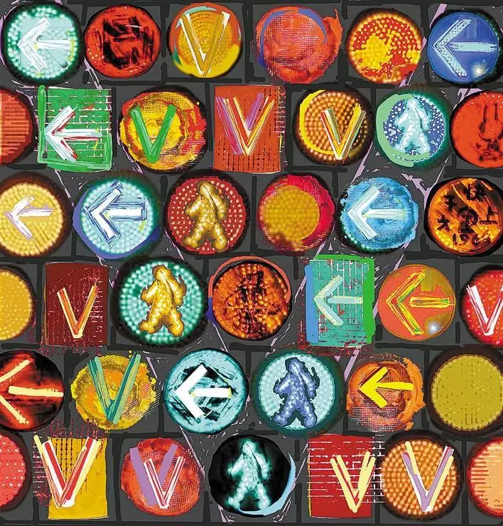 梁宇透露,這件作品的創(chuàng)作四易其稿,將信號(hào)燈所指代的“社會(huì)規(guī)則”加以排列強(qiáng)化,以此強(qiáng)調(diào)“秩序”本身在與疾病博弈混亂環(huán)境中的重要性。作品以濃烈的對(duì)比色彩、緊密排列的幾何圖形試圖傳達(dá)當(dāng)下人們的緊張情緒和焦慮心態(tài)。同時(shí),信號(hào)燈中“行走”、“前進(jìn)”、“Victory”的提示標(biāo)識(shí),被清晰地提煉出來,成為能讓畫面安定的因素,望帶給觀者一點(diǎn)思緒的寧?kù)o與心靈的慰藉。