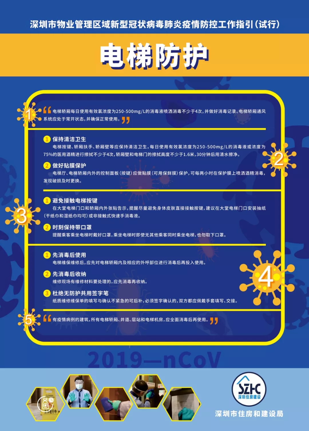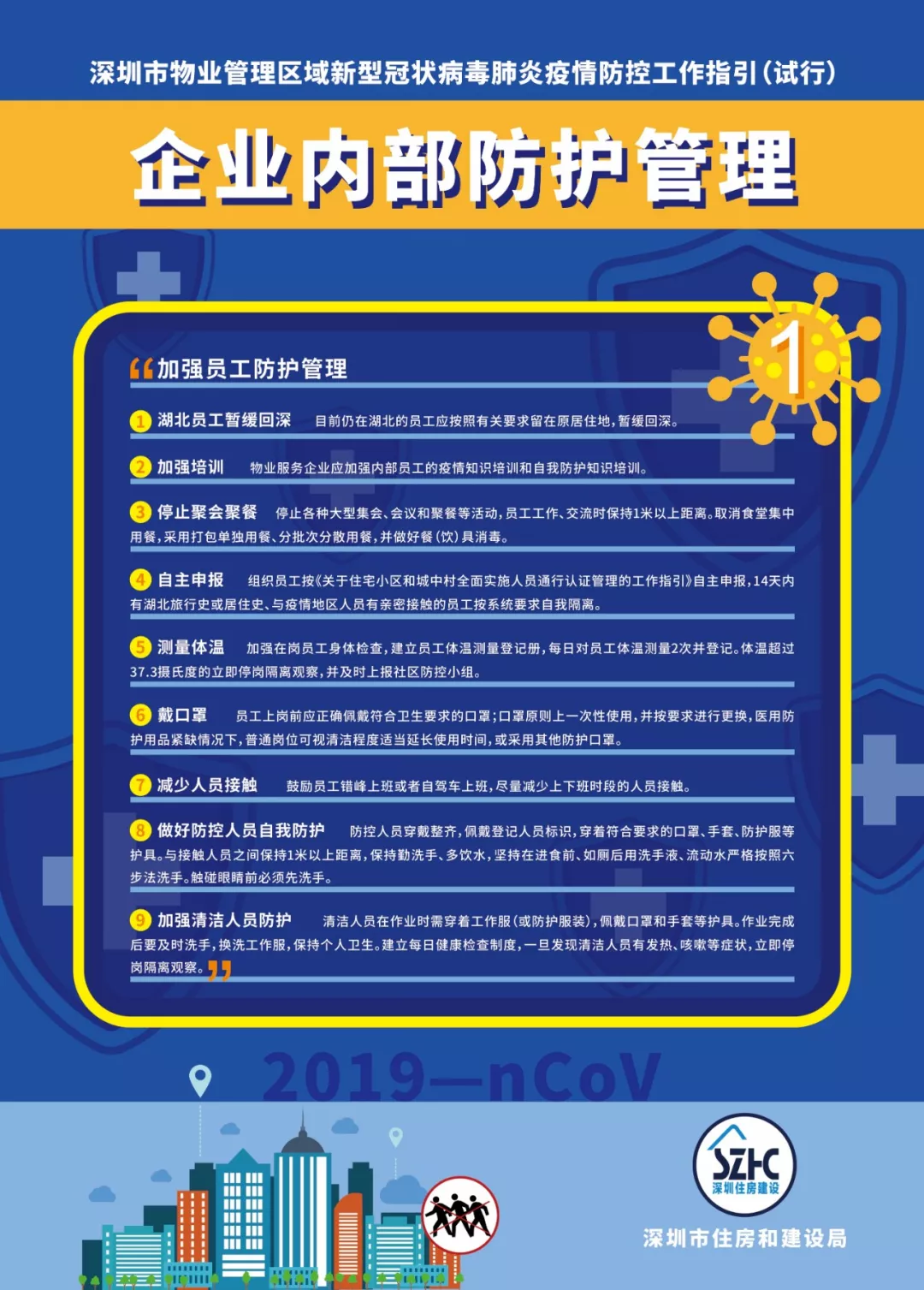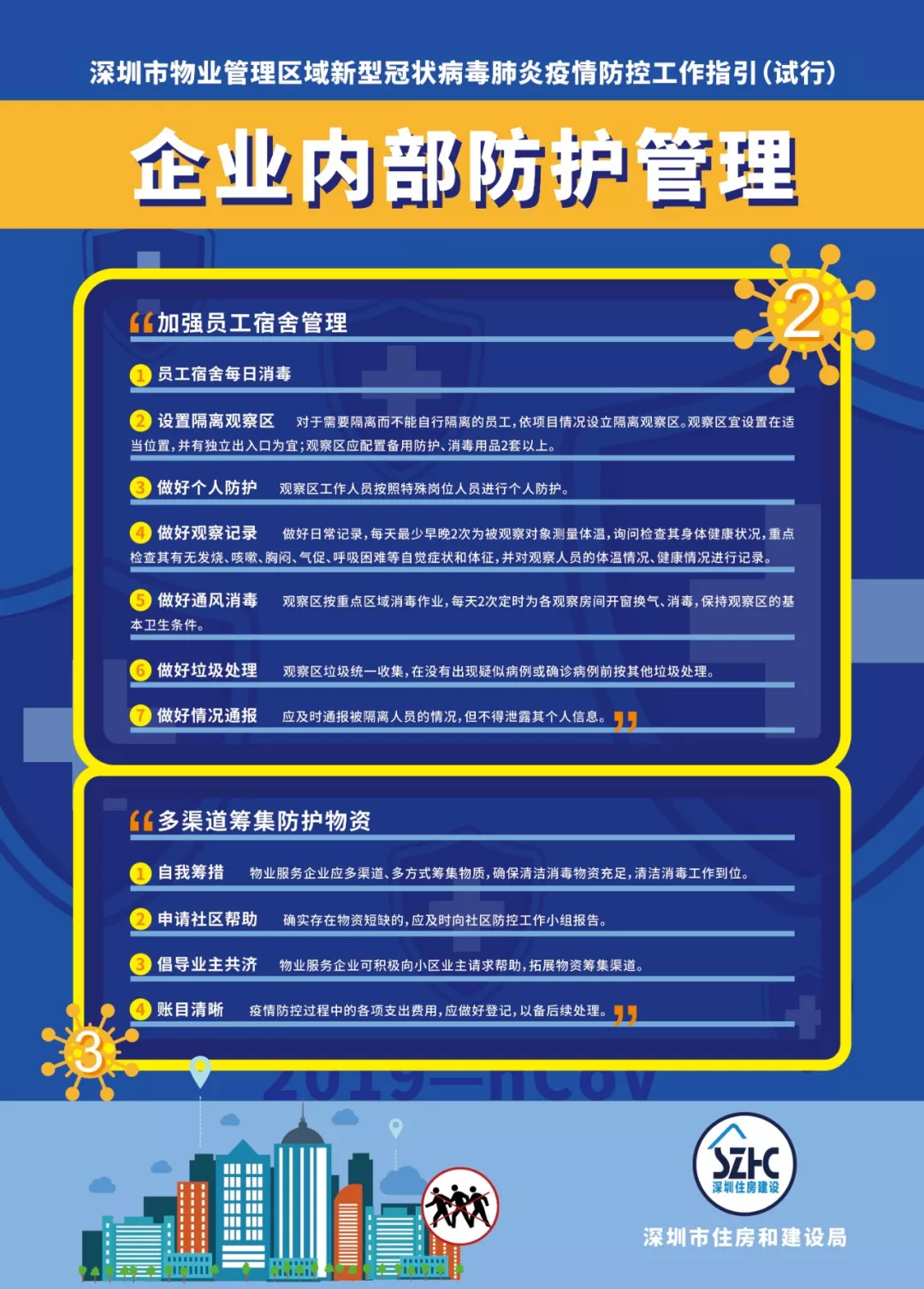 為進一步做好物業(yè)管理區(qū)域新型冠狀病毒肺炎疫情防控工作,依據(jù)《廣東省物業(yè)管理區(qū)域新型冠狀病毒感染的肺炎疫情防控工作指引(試行)》《深圳市新型冠狀病毒感染的肺炎疫情防控指揮部印發(fā)關(guān)于建立健全社區(qū)聯(lián)防聯(lián)控機制的若干措施的通知》《深圳市新型冠狀病毒感染的肺炎疫情防控指揮部辦公室社區(qū)小區(qū)組工作方案》《深圳市新型冠狀病毒感染的肺炎疫情防控指揮部辦公室關(guān)于印發(fā)住宅小區(qū)和城中村全面實施人員通行認證管理的工作指引的通知》等文件,結(jié)合當前實際,市住房建設(shè)局編制了《深圳市物業(yè)管理區(qū)域新型冠狀病毒肺炎疫情防控工作指引(試行)》,現(xiàn)印發(fā)給你們,請參照執(zhí)行。