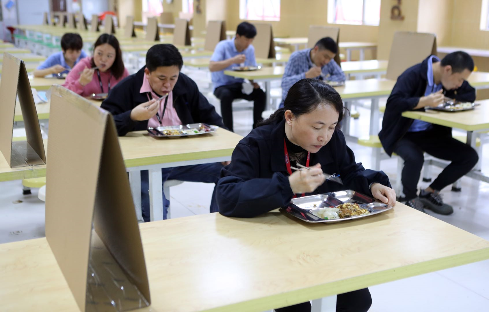這樣的座位安排方式和擋板在員工食堂同樣可以看到。不同的是,就餐員工被嚴(yán)格分流,采取多時(shí)段少人次的方式分時(shí)段分批就餐。