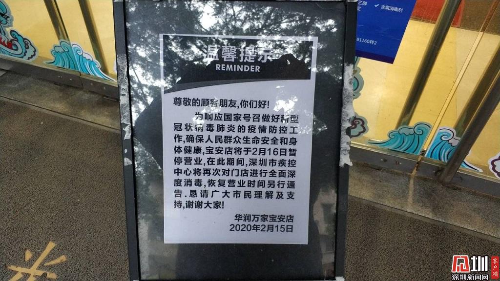 見(jiàn)圳客戶端·深圳新聞網(wǎng)2020年2月16日訊(見(jiàn)圳客戶端、深圳新聞網(wǎng)記者 陳婕 呂敏)根據(jù)疾控部門通報(bào),寶安區(qū)新安街道五區(qū)華潤(rùn)萬(wàn)家商場(chǎng)三樓福浪多老年裝柜臺(tái)一員工,于2020年2月14日被確診為新型冠狀病毒肺炎患者。16日,華潤(rùn)萬(wàn)家寶安店暫停營(yíng)業(yè),記者通過(guò)華潤(rùn)萬(wàn)家深圳營(yíng)運(yùn)區(qū)域總經(jīng)理兼寶安區(qū)沙井店店長(zhǎng)李洪舟獲悉,該員工目前在深圳市第三人民醫(yī)院接受治療;2月10日該員工上班時(shí)佩戴了口罩,當(dāng)天沒(méi)有接觸顧客,接觸的6名同事已隔離,目前情況良好,未出現(xiàn)發(fā)燒癥狀。在此期間,深圳市疾控中心將再次對(duì)門店進(jìn)行全面深度消毒,恢復(fù)營(yíng)業(yè)時(shí)間將另行通知。