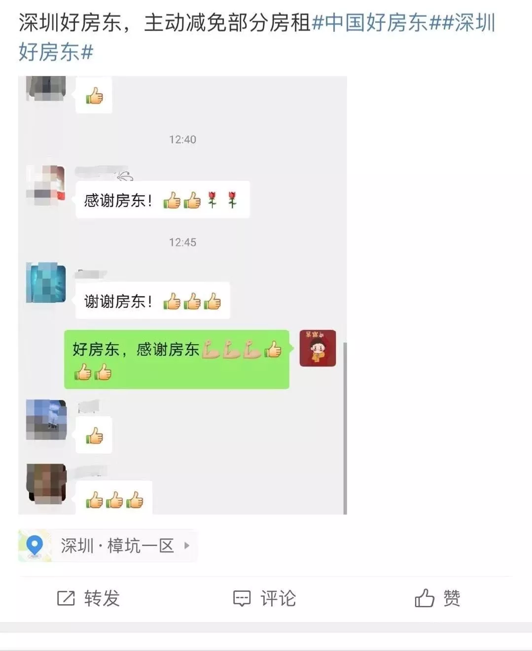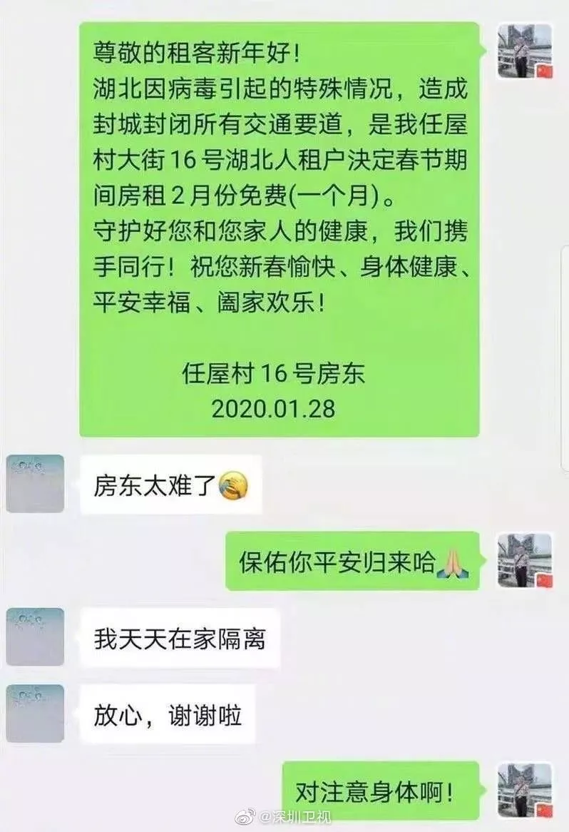C******a:我有一位龍崗朋友是房東,他們給所有租客都減免了半個月的房租。暖心感動!