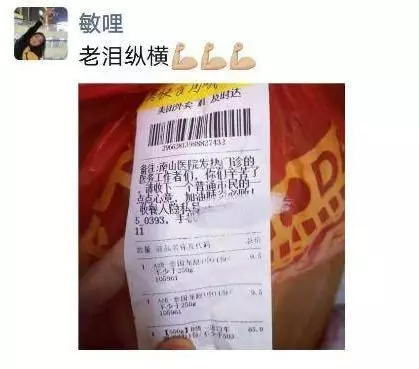 1月30日晚上8點(diǎn)56分,華中科技大學(xué)協(xié)和深圳醫(yī)院(南山醫(yī)院)手外科護(hù)士王敏在朋友圈曬了一張照片,照片里是一個(gè)紅色塑料袋上貼著一張外賣單,備注上寫著,“南山醫(yī)院發(fā)熱門診的醫(yī)務(wù)工作者們,你們辛苦了!請(qǐng)收下一個(gè)普通市民的一點(diǎn)點(diǎn)心意,加油,肺炎必?cái)?!?/p>