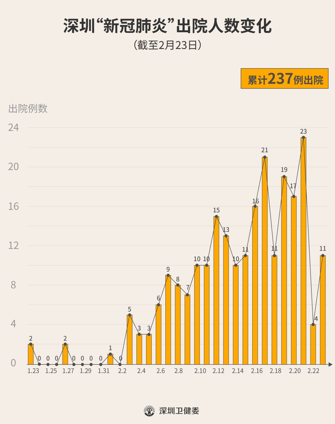 2月23日下午,經(jīng)專家組會診,深圳有11名新型冠狀病毒肺炎確診患者出院,累計(jì)達(dá)237人,連續(xù)21天有人出院。