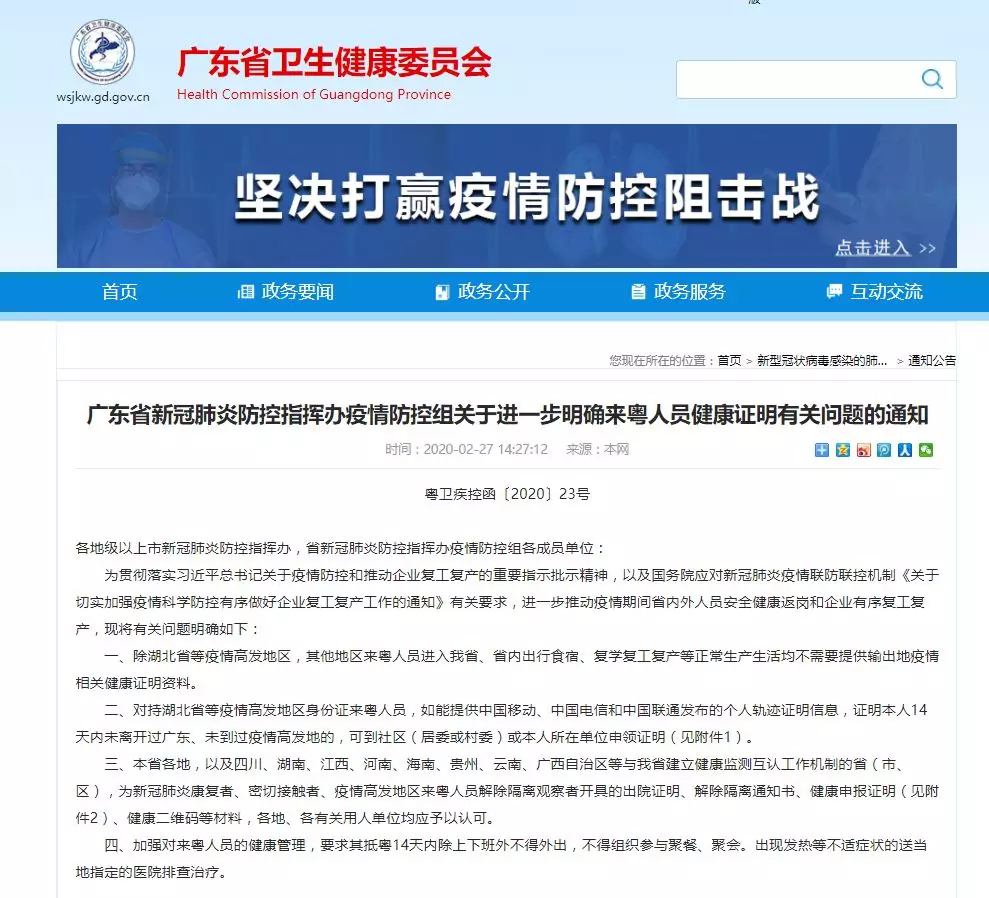 廣東省新冠肺炎防控指揮辦疫情防控組關(guān)于進(jìn)一步明確來粵人員健康證明有關(guān)問題的通知