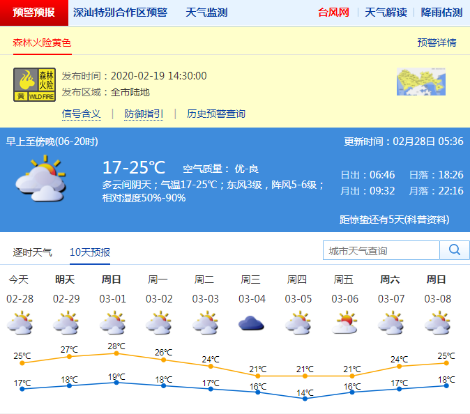 見(jiàn)圳客戶端·深圳新聞網(wǎng)2020年2月28日訊 深圳市氣象臺(tái)預(yù)計(jì),27日晚到28日,深圳陰天間多云,氣溫18-25 ℃,相對(duì)濕度50%-95%,東風(fēng)3-4級(jí),沿海、高地和海區(qū)陣風(fēng)可達(dá)7級(jí);29日至3月3日多云為主,天氣總體溫暖,氣溫小幅波動(dòng),早晚有輕霧,偶有零星小雨;4日 -5日受冷空氣影響,氣溫明顯下降,其中4日有零星小雨。