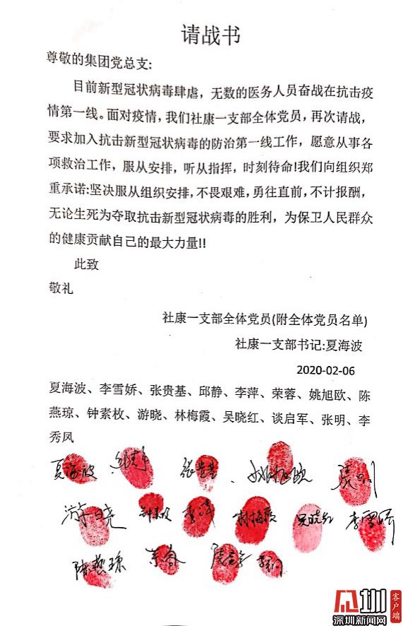 見(jiàn)圳客戶端·深圳新聞網(wǎng)訊(記者 董非)“讓黨旗在防控斗爭(zhēng)第一線高高飄揚(yáng)。”新冠肺炎疫情發(fā)生以來(lái),南山區(qū)醫(yī)療集團(tuán)總部黨員勇當(dāng)先鋒,以實(shí)際行動(dòng)踐行初心使命,涌現(xiàn)出眾多感人故事,展現(xiàn)了共產(chǎn)黨員的風(fēng)采與擔(dān)當(dāng)。 疫情發(fā)生后,南山區(qū)第一時(shí)間制定出臺(tái)了《黨建引領(lǐng)疫情防控工作五項(xiàng)行動(dòng)方案》,南山區(qū)委書記王強(qiáng)號(hào)召全體黨員,發(fā)揮黨組織的戰(zhàn)斗堡壘作用和黨員的先鋒模范作用,全力保障人民群眾生命安全和身體健康,讓黨旗在防控疫情斗爭(zhēng)第一線高高飄揚(yáng),堅(jiān)決打贏疫情防控人民戰(zhàn)爭(zhēng)、總體戰(zhàn)、阻擊戰(zhàn)。南山區(qū)醫(yī)療集團(tuán)總部積極響應(yīng),黨建引領(lǐng)下的防控抗疫工作有序科學(xué)地展開。 今年1月底,深圳市南山區(qū)區(qū)委授旗成立南山醫(yī)療系統(tǒng)黨員突擊隊(duì)。南山區(qū)醫(yī)療集團(tuán)總部緊急組建了防控新冠肺炎應(yīng)急突擊隊(duì),僅一天內(nèi)區(qū)醫(yī)療集團(tuán)就共有169人完成第一批應(yīng)急突擊隊(duì)報(bào)名,其中黨員過(guò)半數(shù)。 疾風(fēng)知?jiǎng)挪?,烈火煉真金。一封封?qǐng)戰(zhàn)書閃電匯聚到黨總支,召即來(lái),來(lái)能戰(zhàn),戰(zhàn)能勝,沖鋒在前就是擔(dān)當(dāng)?shù)淖蠲姥堇[;一位位黨員迅速入隊(duì)黨員突擊隊(duì),他們重溫入黨誓言,在黨旗下實(shí)踐著醫(yī)者仁心、人間大愛(ài);一份份入黨申請(qǐng)書紛沓而來(lái),特殊時(shí)期經(jīng)受特殊考驗(yàn),一批優(yōu)秀的醫(yī)護(hù)人員頁(yè)主動(dòng)向黨組織靠攏。鏗鏘的語(yǔ)言、堅(jiān)定的決心、舍我的擔(dān)當(dāng),是南山區(qū)醫(yī)療集團(tuán)總部廣大黨員逆行而上、抗擊疫情的堅(jiān)定決心和必勝信心。 最美逆行黨支部,積極請(qǐng)戰(zhàn)敢擔(dān)當(dāng) “我是共產(chǎn)黨員,我請(qǐng)戰(zhàn)!愿為戰(zhàn)勝疫情全力以赴!”這是南山區(qū)醫(yī)療集團(tuán)總部一支部13名黨員和2名入黨積極分子聯(lián)名撰寫的《請(qǐng)戰(zhàn)書》(節(jié)選)。 面對(duì)新冠肺炎疫情,一支部黨員在夏海波支部書記夏海波的帶領(lǐng)下,在發(fā)熱門診、發(fā)熱患者預(yù)檢分診、社區(qū)“三位一體”排查等工作中,積極發(fā)揮共產(chǎn)黨員戰(zhàn)斗在一線、沖鋒在一線的模范帶頭作用,為戰(zhàn)勝新冠肺炎疫情全體黨員積極主動(dòng)請(qǐng)戰(zhàn),并向集團(tuán)黨總支遞交了請(qǐng)戰(zhàn)書。 社康一支部全體黨員的請(qǐng)戰(zhàn)書 一個(gè)個(gè)紅手印,令人淚目,彰顯著南山區(qū)醫(yī)療集團(tuán)總部白衣天使們逆行而上的使命擔(dān)當(dāng)和責(zé)任意識(shí)。 一支部書記夏海波說(shuō),“成為疫情防控工作第一線發(fā)展黨員,是面對(duì)疫情充分發(fā)揮黨員先鋒作用的具體實(shí)踐。此次請(qǐng)戰(zhàn),將更加激勵(lì)他們我們?cè)诮窈蟮墓ぷ魈貏e是近期防疫防控工作中,以黨員的標(biāo)準(zhǔn)嚴(yán)格要求自己,發(fā)揮黨員先鋒模范作用。同時(shí),也會(huì)對(duì)全院全體員工產(chǎn)生積極引領(lǐng)、鼓舞作用,以更飽滿的斗志投入防疫防控工作?!?/p> 老黨員重溫入黨誓詞,面對(duì)黨旗表決心 “我宣誓:我志愿加入中國(guó)共產(chǎn)黨……”這是一次特別的宣誓。接到組織號(hào)召后,社康二支部的老黨員鐘達(dá)宏和吳麗娉,對(duì)著黨旗,以重溫入黨誓詞的方式,不忘黨員初心,牢記使命,積極沖鋒在前,誓要打贏防控狙擊戰(zhàn)。 社康二支部的老黨員鐘達(dá)宏和吳麗娉,對(duì)著黨旗,重溫入黨誓詞,誓要打贏防控狙擊戰(zhàn) 面對(duì)來(lái)勢(shì)洶洶的疫情,南山區(qū)醫(yī)療集團(tuán)總部的黨組織和黨員干部不但沒(méi)有被嚇倒,反而激起了他們昂揚(yáng)的戰(zhàn)斗意志和飽滿的工作熱情。 “我宣誓,我自愿加入抗擊新型冠狀病毒肺炎疫情防控工作隊(duì)伍,責(zé)任上肩,聽黨指揮,服從命令,科學(xué)應(yīng)對(duì),恪盡職守,努力守護(hù)轄區(qū)居民健康,堅(jiān)決打贏疫情防控攻堅(jiān)戰(zhàn)!”守土有責(zé)、守土擔(dān)責(zé)、守土盡責(zé),所有社康中心的黨員干部將筑牢抗疫的基層防線,誓要守護(hù)轄區(qū)居民的生命健康。 社康二支部黨員在黨旗下宣誓努力守護(hù)轄區(qū)居民健康 艱難時(shí)刻主動(dòng)請(qǐng)戰(zhàn),夫妻雙雙奮戰(zhàn)一線 1月26日,南山區(qū)醫(yī)療集團(tuán)總部下發(fā)關(guān)于組建防控新型冠狀病毒感染肺炎應(yīng)急突擊隊(duì)報(bào)名的通知。除了得到集團(tuán)黨員們的積極響應(yīng)之外,各個(gè)支部涌現(xiàn)出一波遞交入黨申請(qǐng)書的小高潮。 李婧是社康支部的一名全科醫(yī)生,一直在社康醫(yī)院中心從事全科醫(yī)療工作,戰(zhàn)“疫”的號(hào)角吹響,李婧第一時(shí)間參戰(zhàn),在所有抗疫時(shí)期入黨人員里第一個(gè)遞交了手寫入黨申請(qǐng)書。 李婧醫(yī)生的手寫入黨申請(qǐng)書 起初,她所在的蔚藍(lán)海岸社康中心考慮到李婧的愛(ài)人是深圳市公立醫(yī)院急診科醫(yī)生其愛(ài)人是深圳市某公立醫(yī)院的急診科醫(yī)生,疫情發(fā)生以來(lái)一直堅(jiān)守在崗位上,家中尚