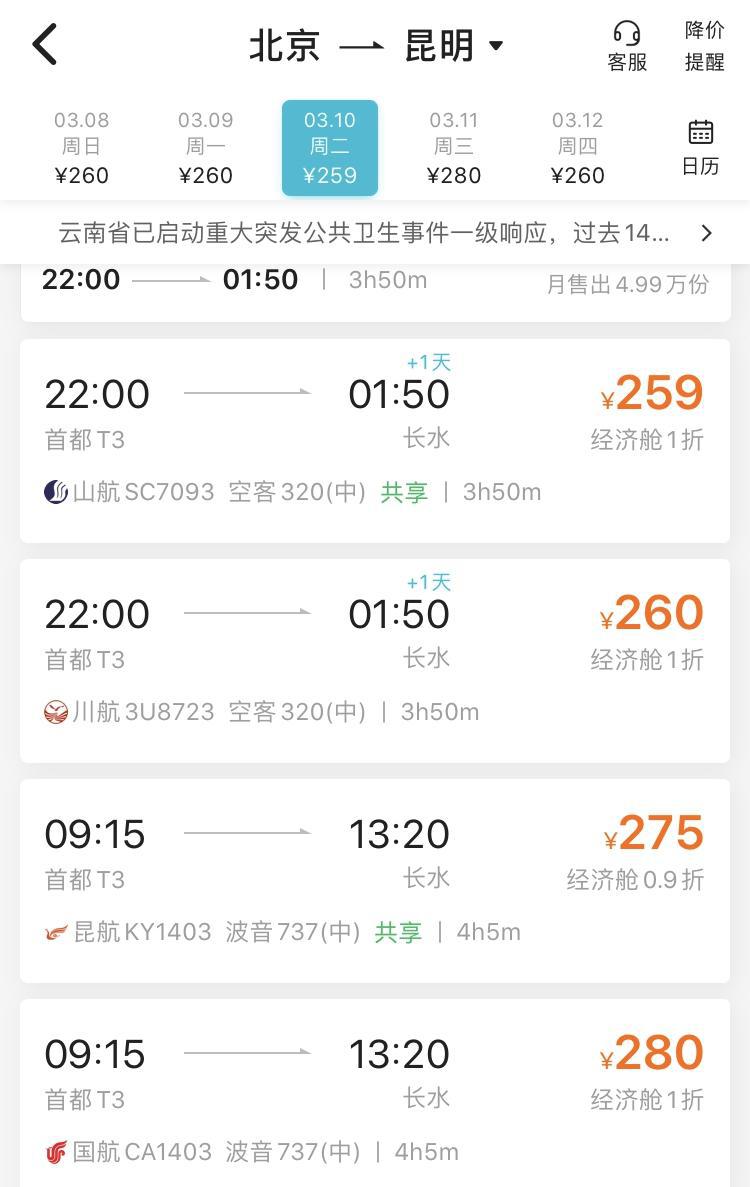 此外,3月份,由北京、上海等城市出發(fā)的航班也出現(xiàn)了1折左右的"白菜價"。比如去哪兒旅行 APP上顯示,3月10日,北京飛昆明的山航 SC7093航班,機票價格最低為259元,折扣為經(jīng)濟艙全票的1折。當(dāng)天,川航3U8723、昆航 KY1403、國航 CA1403等航班的最低票價,也僅為經(jīng)濟艙全票的1折左右,價格分別為260元、275元、280元。