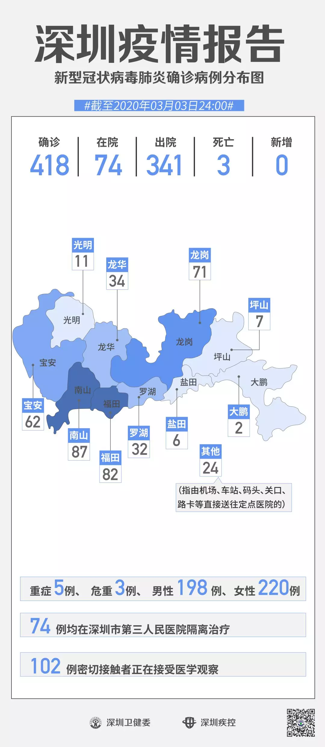 截至3月3日24時(shí),深圳累計(jì)報(bào)告“新冠肺炎”確診病例418例。3月3日當(dāng)天全市無(wú)新增確診病例,當(dāng)天出院病例9例(從2月26日起不再公布出院個(gè)案)。