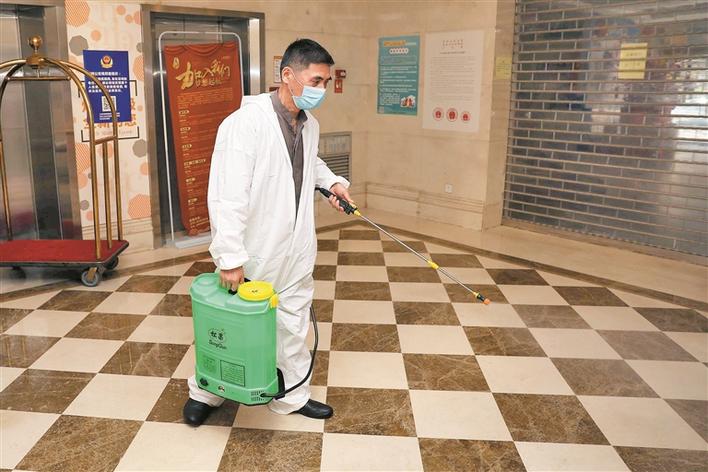▲工作人員對(duì)酒店大堂進(jìn)行消毒。深圳晚報(bào)記者楊少昆攝