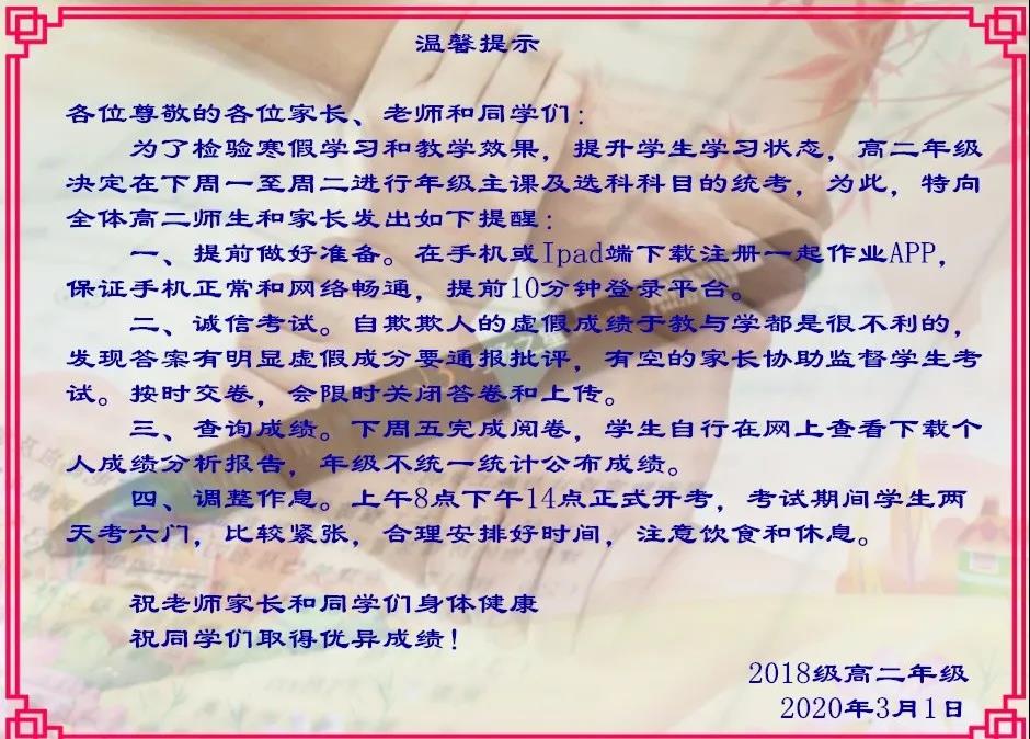 為了提高考試的可信度,考前各班級(jí)還進(jìn)行了誠(chéng)信教育,讓學(xué)生明白誠(chéng)信考試的重要性以及自欺欺人的危害,并發(fā)動(dòng)居家的家長(zhǎng)積極配合監(jiān)考。考前,學(xué)校也向老師學(xué)生和家長(zhǎng)發(fā)了提示,提醒網(wǎng)上考試注意事項(xiàng)。