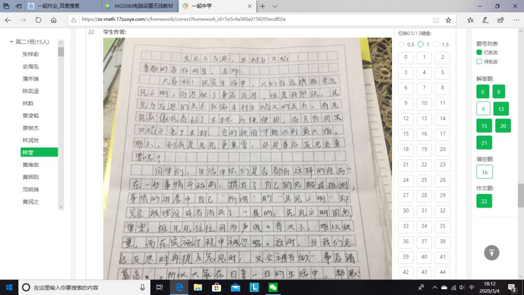 早在網(wǎng)課開(kāi)始第二周,針對(duì)老師們對(duì)網(wǎng)課效率不高的顧慮,高二年級(jí)就做了一次網(wǎng)上調(diào)查,絕大部分老師贊成進(jìn)行一次網(wǎng)上考試,以檢驗(yàn)網(wǎng)課的學(xué)習(xí)效果,以便調(diào)整教學(xué)。之后,學(xué)校開(kāi)始著手準(zhǔn)備網(wǎng)上考試,向技術(shù)平臺(tái)提交學(xué)生和老師信息,下發(fā)《一起作業(yè)學(xué)生注冊(cè)登錄指引》和《一起作業(yè)教師作業(yè)批改操作指南》。年級(jí)各備課組開(kāi)始命題,為了檢驗(yàn)二實(shí)“線(xiàn)上學(xué)堂”的實(shí)效,學(xué)校要求命題的范圍以直播課內(nèi)容為主,兼顧寒假作業(yè)??记耙恢?,各備課組都上交平臺(tái)進(jìn)行試卷制作。2月26日,網(wǎng)上作業(yè)批改功能正式上線(xiàn),高二年級(jí)要求備課組在考試之前至少利用線(xiàn)上平臺(tái)布置批改一次網(wǎng)上作業(yè),積累經(jīng)驗(yàn),提醒平臺(tái)改進(jìn)不完善的問(wèn)題,及時(shí)更新,同時(shí)讓學(xué)生和老師熟悉操作技巧。備課組在考前都向?qū)W生發(fā)布了考試注意事項(xiàng),要求學(xué)生豎拍照片,注意字跡大小和拍照清晰度,單題上傳,試卷在閱讀頁(yè)面和題目設(shè)置也做了優(yōu)化,大大方便了學(xué)生答題,有效減輕老師改卷負(fù)擔(dān),提高了閱卷的效率。