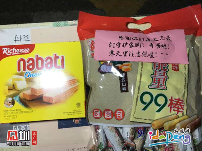 2月18日晚上,一輛奔馳車停在歐新?lián)峡c,車上下來一名女士,放下一大包零食,說了句“辛苦了”轉(zhuǎn)身就走了……零食上還貼著一張便條:“感謝你們每天為我們守護(hù)家園!辛苦啦!寒天里注意保暖!”