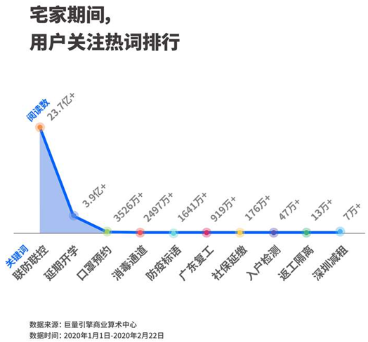 在1月1日至2月22日的頭條用戶閱讀數(shù)據(jù)中,聯(lián)防聯(lián)控、延期開(kāi)學(xué)、口罩預(yù)約成為頭條平臺(tái)上最熱的關(guān)鍵詞前三位。此外、社保延繳、返工隔離等政府措施都被疫情下的手機(jī)用戶頻繁閱讀。