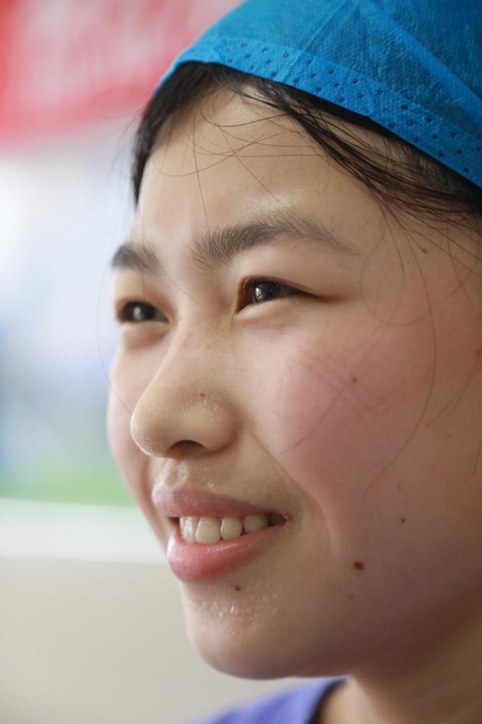黃青青性格開朗,適應(yīng)能力強(qiáng),她平時(shí)不愛吃的胡蘿卜、包菜等食物,但到了一線再也不挑食了。身材瘦弱的她在忙碌十多天后有些消瘦,但她總是打趣道:“別看我瘦,力量可大著呢!”協(xié)助病人翻身,耐心為病人喂飯,只要病人需要的,她都會(huì)盡自己的全力做好,病區(qū)的病人也為她豎起大拇指。
