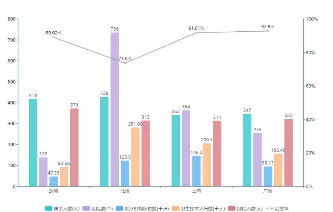 ▲對比北京、上海、廣州等城市,深圳的醫(yī)院數(shù)、床位數(shù)及衛(wèi)生技術(shù)人員數(shù)量都處在第四位,醫(yī)療資源現(xiàn)有儲備略顯不足,勢必給疫情防控過程中的患者救治工作帶來嚴(yán)峻考驗(yàn)。