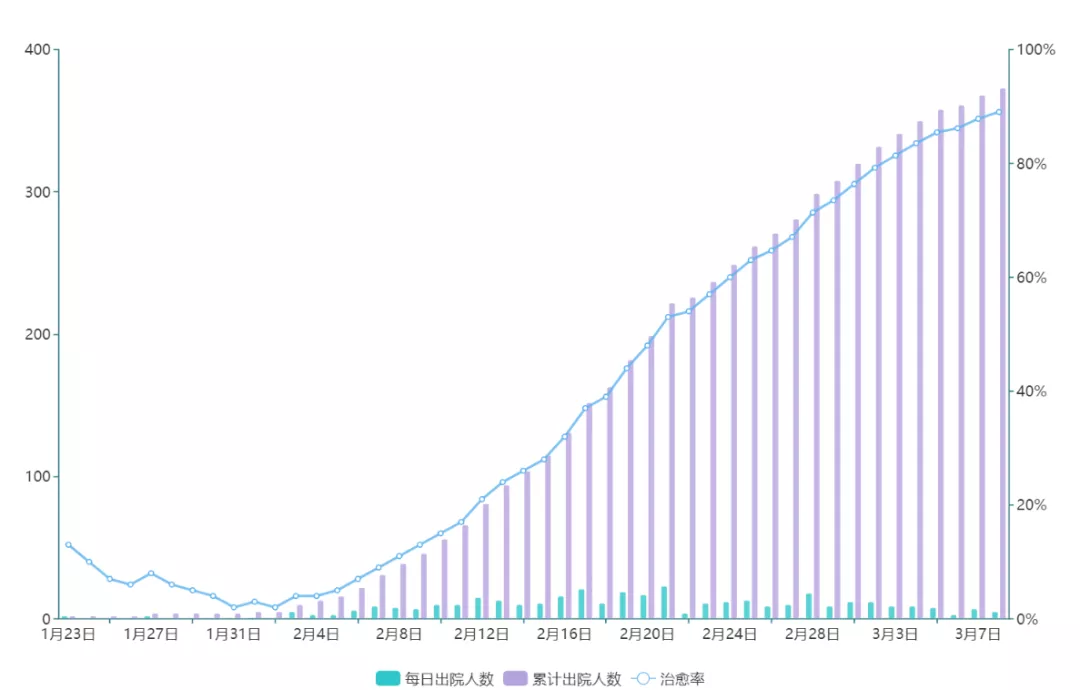 ▲目前,累計已出院373例,治愈率超過89%,高于全國(72.6%)16.4個百分點(diǎn)。