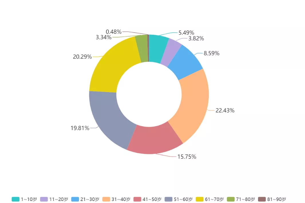 ▲新冠肺炎患者以中老年人為主,年齡在50歲以上的患者占到了總數(shù)的43.92%。但也應(yīng)注意到,10歲以下的兒童確診人數(shù)達(dá)23人,青少年同樣存在感染風(fēng)險。