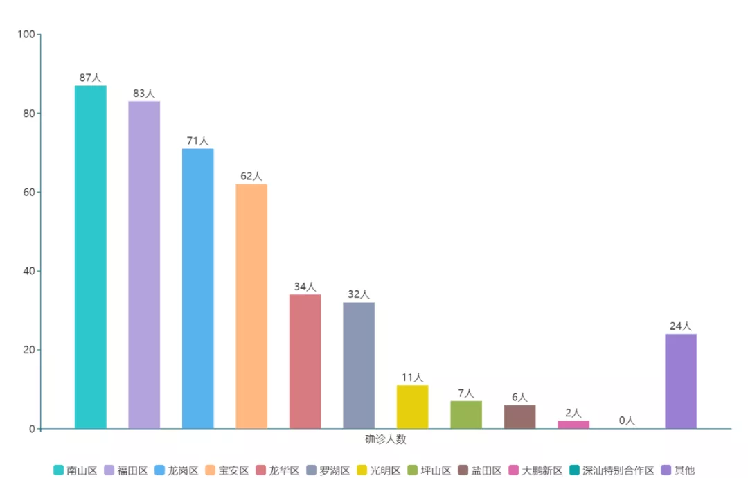 ▲按照區(qū)域劃分,已公布的確診病例中,南山區(qū)87例、福田區(qū)83例、龍崗區(qū)71例、寶安區(qū)62例,為患者較多的幾個區(qū),與其人口較多、經(jīng)濟(jì)發(fā)達(dá)有關(guān)。深汕特別合作區(qū)暫未出現(xiàn)病例。