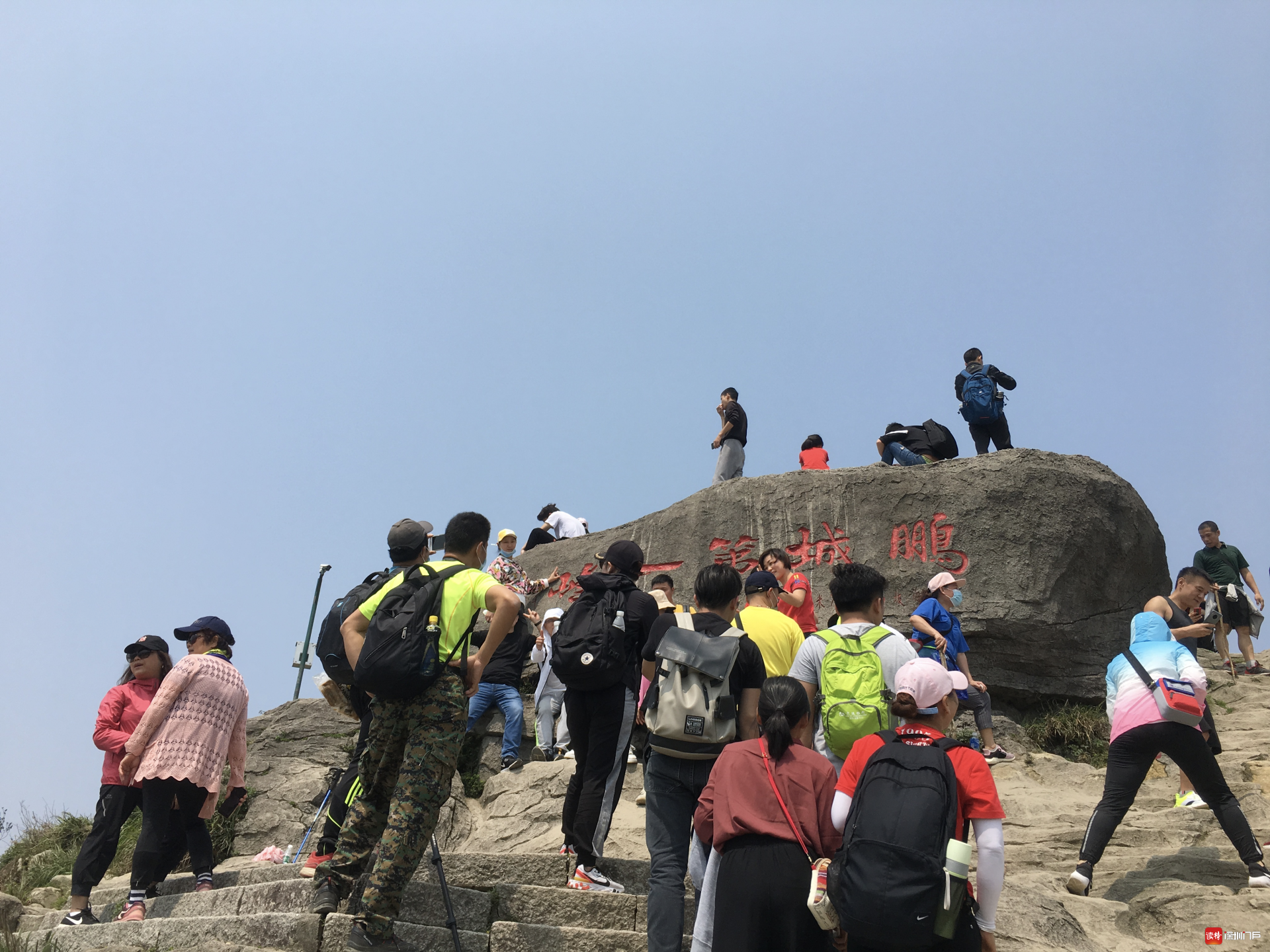 好漢坡是去往大梧桐的登山道之一,長(zhǎng)度有100多米,非常陡峭,但游人卻比其他登山道多了許多。整個(gè)陡坡中部種滿一排杜鵑,吸引游人前往觀賞和拍照。在大梧桐,刻有“鵬城第一峰”的巨石是海拔最高處,是整個(gè)梧桐山游客最密集的地方。在巨石前,拍照需要排隊(duì),還有游客對(duì)著群山吶喊。