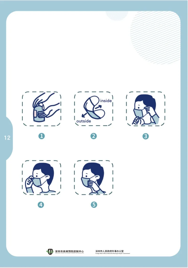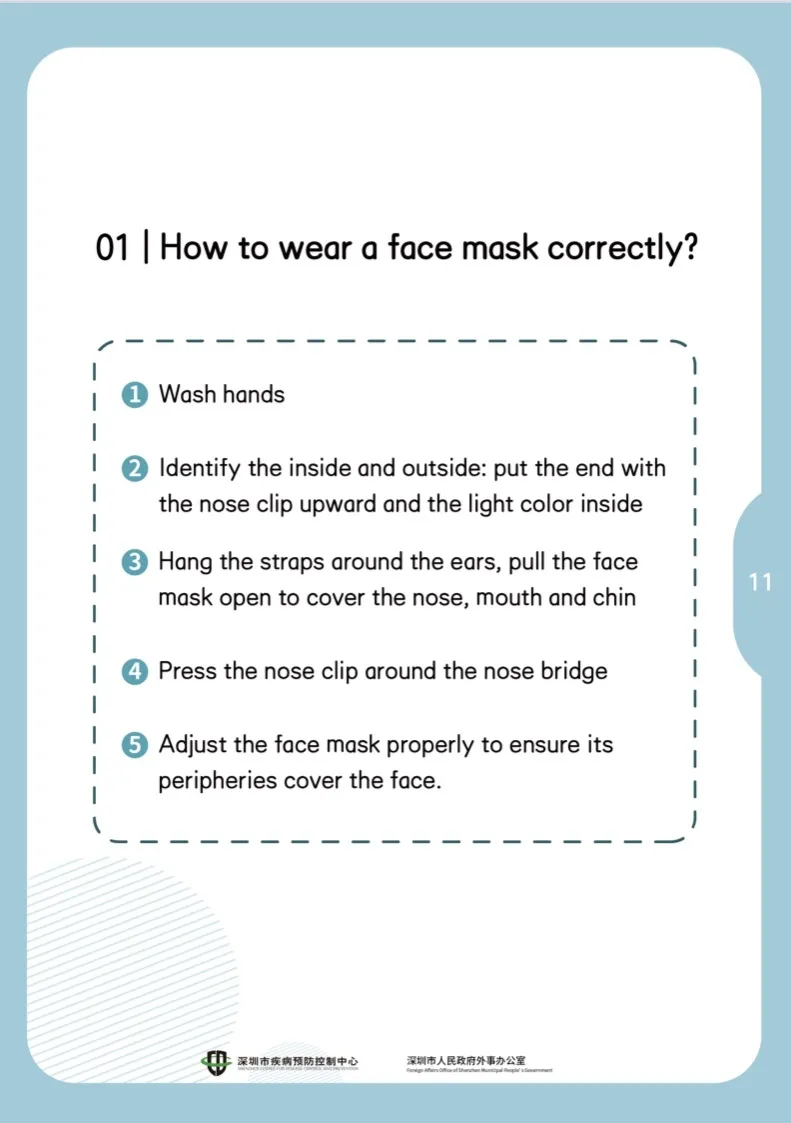 首先洗手——確認(rèn)內(nèi)外:有鼻夾的一端朝上,淺色一面朝自己——將掛繩繞在耳朵上,拉開(kāi)口罩,把鼻、口、下巴罩好——把鼻夾沿鼻梁處貼緊——適當(dāng)調(diào)整口罩,使口罩周邊充分貼合面部。