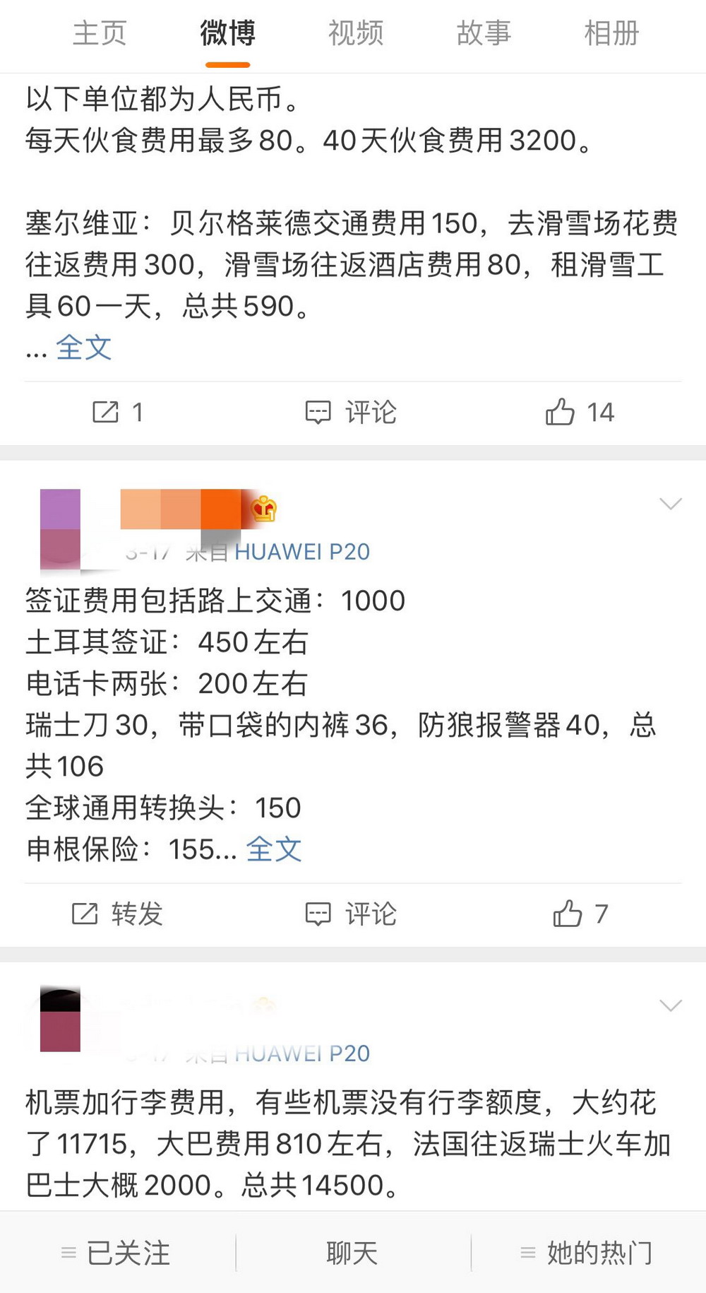 當事人在微博上公布的旅行費用