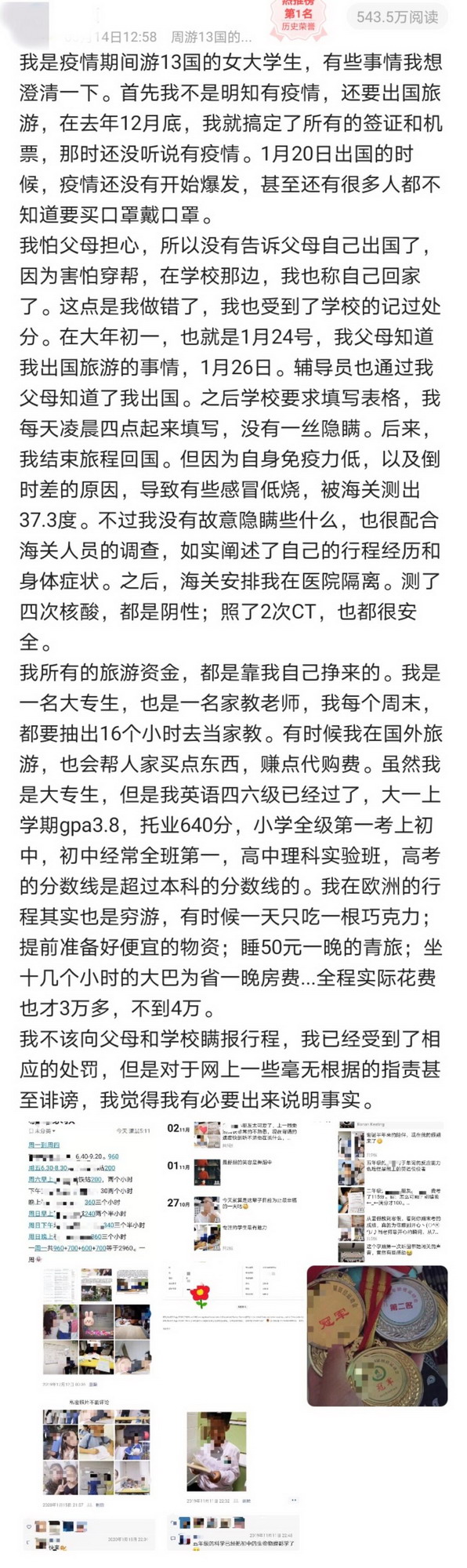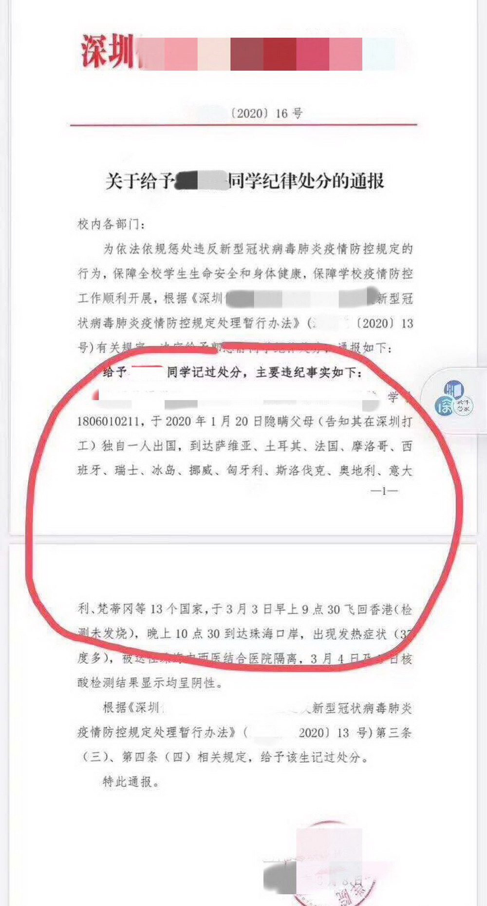 記者從小Y處了解到,1月20日,她出發(fā)開始旅行并于3月3日從珠海入境回國,期間共游玩13個國家。“10月份就已經(jīng)決定出去玩,11月一直在準備簽證,12月中旬簽證什么的都已經(jīng)準備好了?!庇捎诤ε赂改笓乃蝗嗽谕饴眯械陌踩珕栴},出發(fā)時并沒有告知父母?!?月23日,學校要求所有學生填寫一個假期所在地,我填寫的是‘在家’,因為不想讓家里人知道我在國外,害怕穿幫。出發(fā)時國內(nèi)疫情還沒有爆發(fā),所以不是很清楚國內(nèi)的疫情,也沒想到填這個信息是為了防控疫情所用,所以沒有如實填寫。大年初一,也就是1月24日,我父母知道了我出國的事,對我嚴厲批評。之后學校要求填寫表格,我沒有隱瞞,都是如實填寫?!?/p>