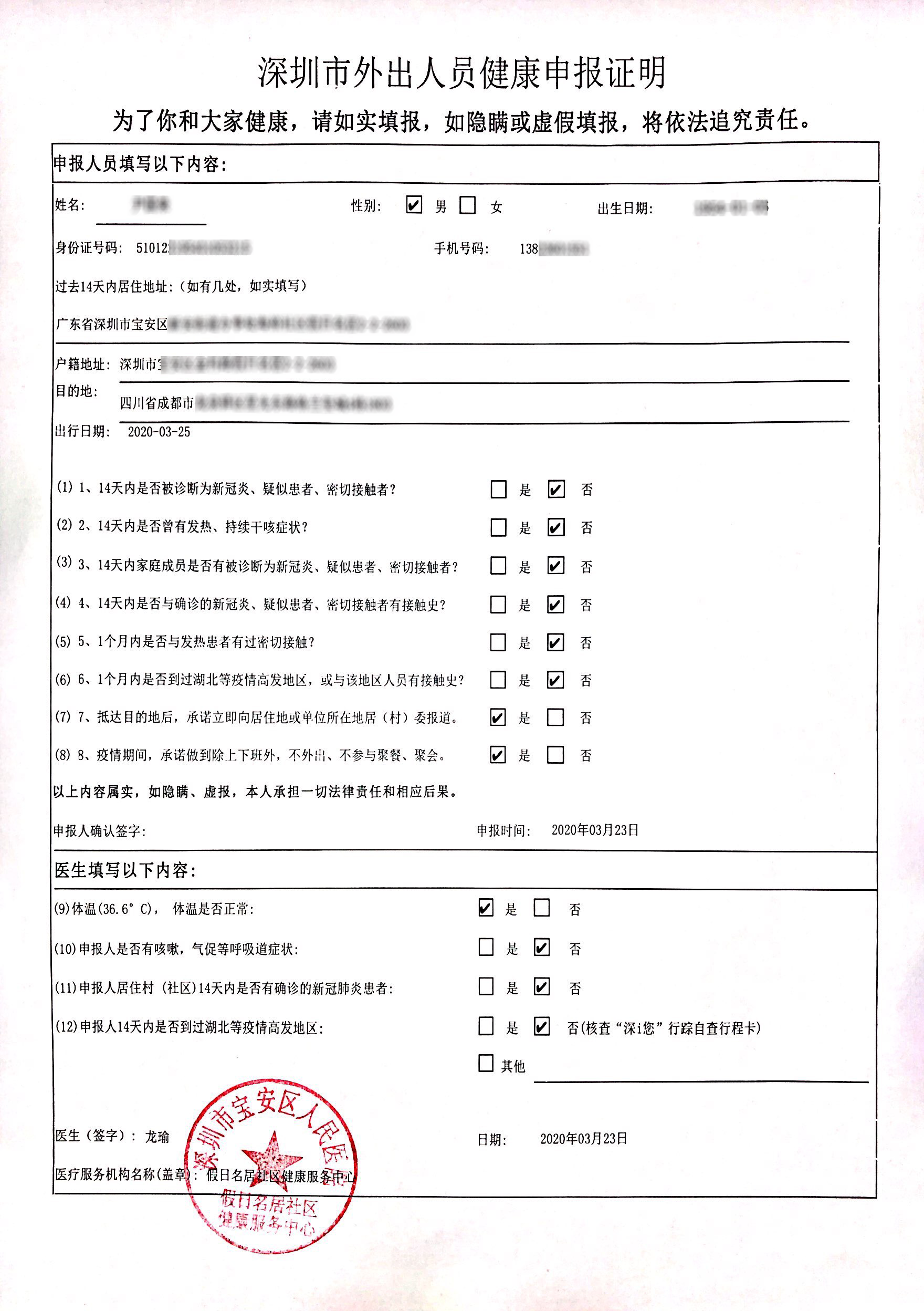 為了保障疫情期間深圳市外出人員的有序正常出行,根據(jù)廣東省要求,疫情期間因出差、經(jīng)商、務工等原因需到外?。ㄊ?、區(qū) )的居民,如果出行目的地要求提供健康證明,可免費申請辦理《深圳市外出人員健康申報證明》。