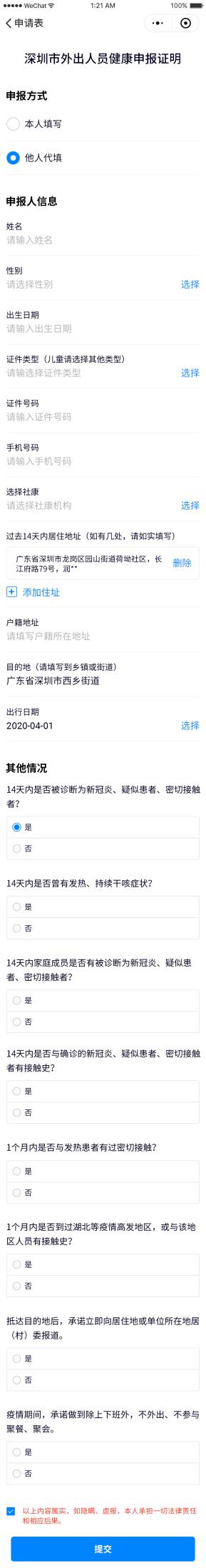 目前,深圳全市所有社康均可出具 《深圳市外出人員健康申報證明》。需要提醒的是,沒有微信的老人和小孩可由他人代填,此外,如果出行日期和目的地等有所變更,市民只需重新申報即可。