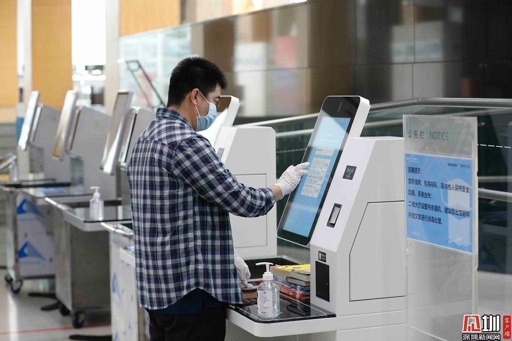 自助借閱機(jī)前,一位讀者正在操作機(jī)器。