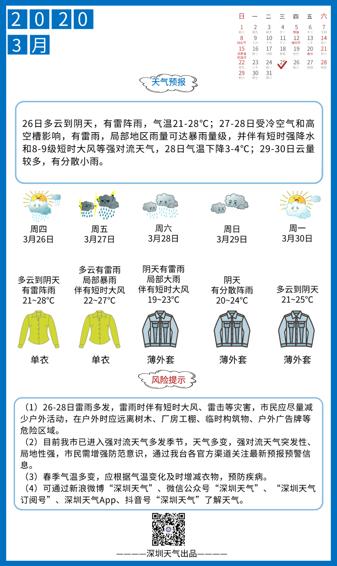 26-28日,深圳雷雨頻繁;26日天氣漸趨不穩(wěn)定,有雷陣雨;27-28日受高空槽、切變線南壓影響,雷雨頻密,局部地區(qū)可達暴雨,伴短時強降水、8-9級短時大風(fēng)和強雷暴等強對流天氣;28日降水趨于減弱。