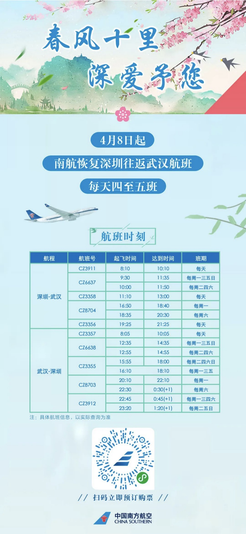 原標題:4月8日起南航恢復(fù)深圳往返武漢航班