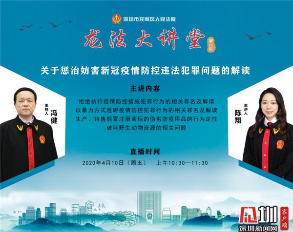 4月10日上午,龍崗法院“龍法大講堂”上線第六講,再次以直播方式,就妨害疫情防控違法犯罪問(wèn)題向觀眾進(jìn)行詳細(xì)解讀。