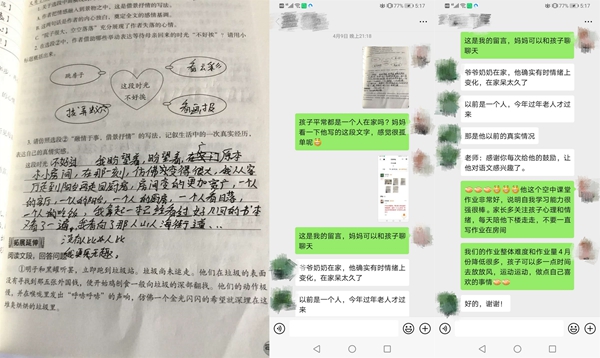 疫情來的迅猛又猝不及防,老師們一方面要完成教學任務、引導學生做好防疫,一方面要時刻關注學生的心理健康。學生們被迫在家度過了一個史上最長的寒假,對于處在叛逆期的孩子們來說,難免會與家人出現(xiàn)一些矛盾,在課堂之外,老師們還需要擔任“心理調(diào)節(jié)師”的角色。一次,周老師班上有個同學因為上網(wǎng)課的事情與父母鬧了矛盾,一氣之下跑到奶奶家,周老師得知了這件事情,第一時間聯(lián)系上學生,通過鼓勵、引導,讓學生認識到自己的錯誤,與父母和解。還有一次,周老師通過批改作業(yè),發(fā)現(xiàn)一名學生在作業(yè)中吐露了自己孤獨、無趣的心聲。看到后,周老師立刻與家長溝通了解情況,并建議家長多多陪伴孩子。盡管老師和學生們不能在學校的課堂上相聚,但在通訊十分發(fā)達的現(xiàn)在,老師們也始終用自己的方式陪伴在學生左右。