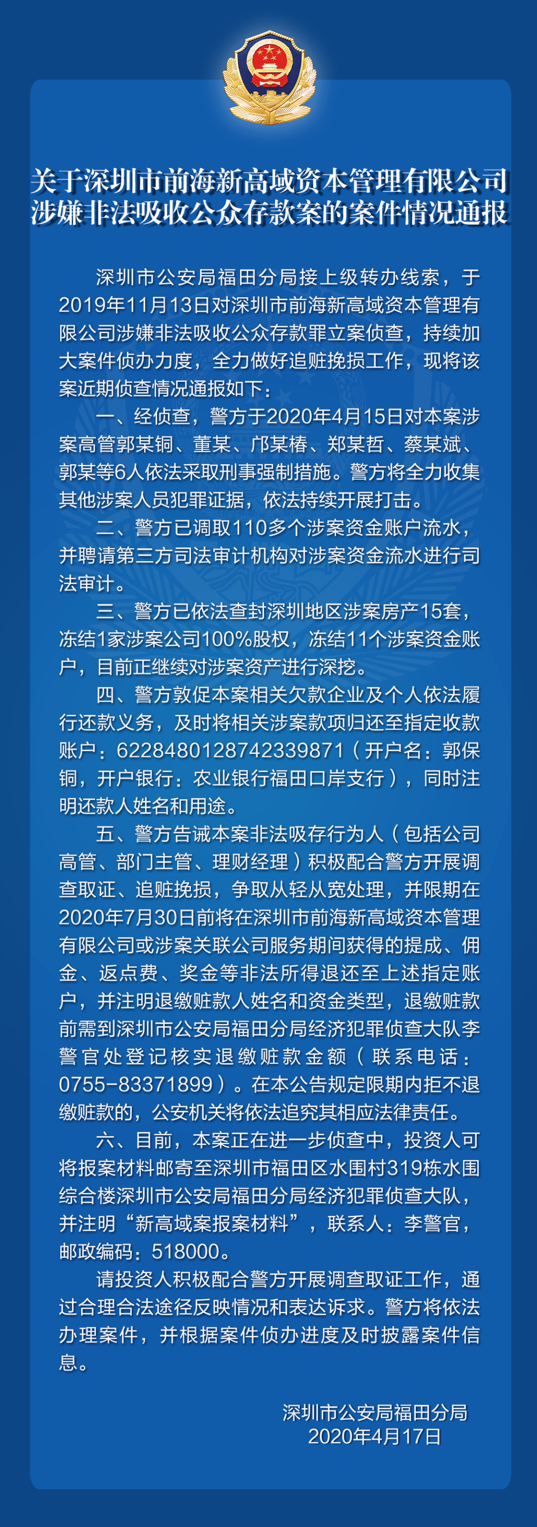 關于深圳市前海新高域資本管理有限公司涉嫌非法吸收公眾存款案的案件情況通報