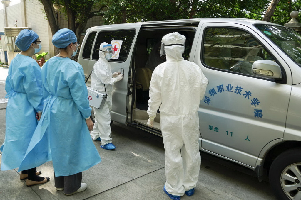 值班護士將疑似患者送上專用車輛。